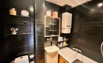 Standard wykończenia: stolarka okienna PCV, na ścianach gładzie i tapety na podłogach panele podłogowe. Łazienka wykończona glazurą i terakotą w czarnej tonacji wyposażona w wannę i umywalkę.