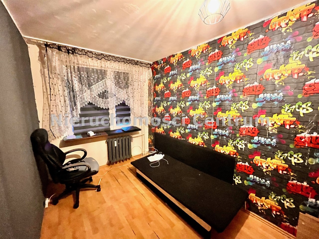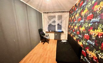 Standard mieszkania: okna PCV, usunięta ścianka działowa miedzy pokojem a kuchnią, na podłodze panele starszej daty na ścianach gładzie z ubytkami oraz tapeta. Łazienka z wanna. Glazura i terakota z ubytkami.